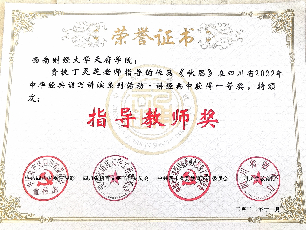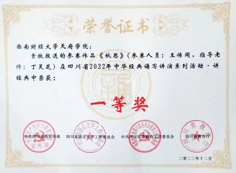 近期,中共四川省委宣传部、四川省语言文字工作委员会、中共四川省委教育工作委员会、四川省教育厅联合公布了“四川省2022年中华经典诵写讲演系列活动”的获奖名单。西财天府中华吟诵推广中心学术总顾问王传闻主讲的《秋思》荣获“诗教中国”大学教师组一等奖,西财天府中华吟诵推广中心主任丁灵芝获得指导教师奖。