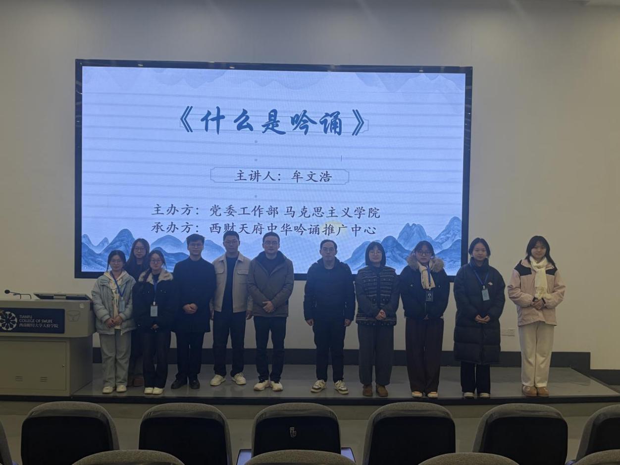 1月5日,由学校党委工作部、马克思主义学院主办,西财天府中华吟诵推广中心承办的“以诵传韵 以文化人”专题讲座在德阳校区B101报告厅举行。本次活动邀请西南财经大学天府学院现代管理学院教师牟文浩担任主讲,共计190余名师生参加活动。