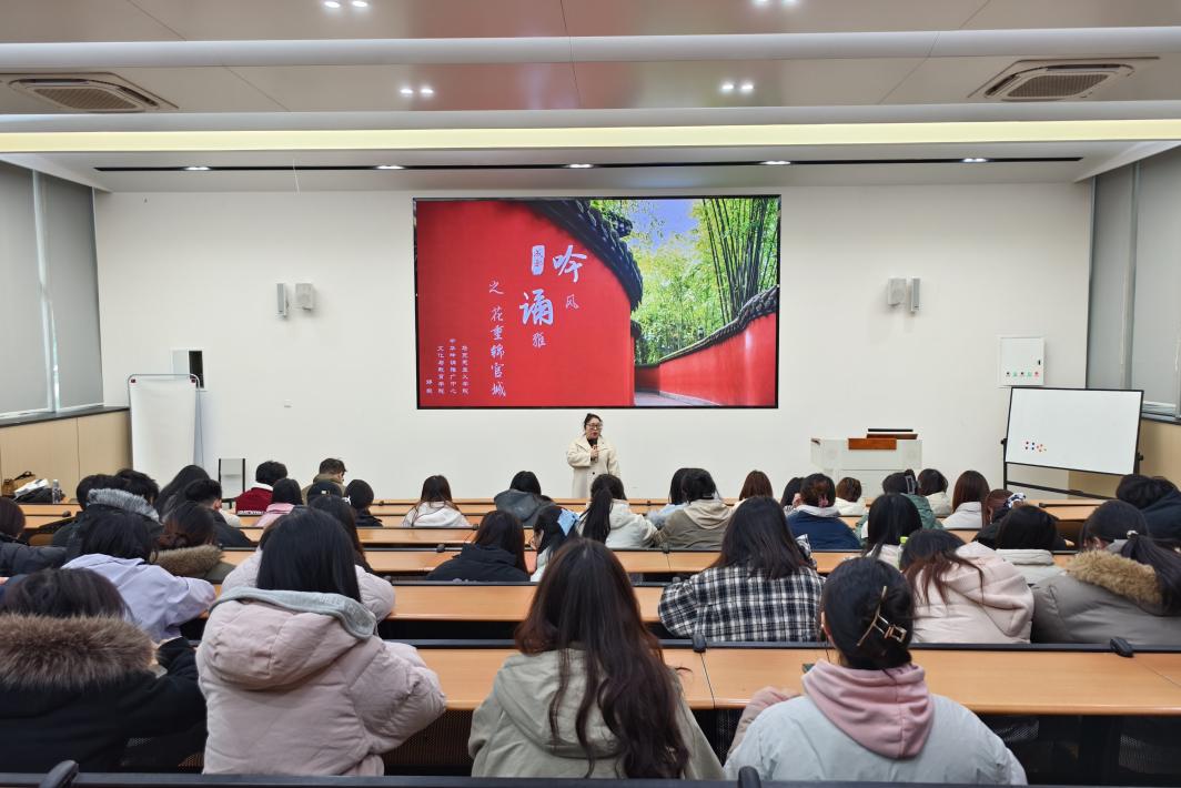 为深入贯彻落实新时代高校立德树人根本任务,推动中华优秀传统文化融入思想政治教育,提升师生人文素养与文化自信,12月30日,马克思主义学院在成都校区(东区)举办了“吟风诵雅之花重锦官城”主题讲座。本次讲座由四川省吟诵学会理事、绵阳市吟诵学会原副会长、文化与教育学院分党委书记邓毅主讲,共计百余名师生参加活动。