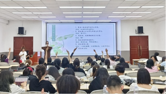 唐丽珊以问题“夏至三候是什么”导入,围绕夏至节气的历史渊源、夏至节气的气候特点以及夏至独特的传统文化习俗展开讲解。互动环节,唐丽珊组织现场同学共同吟诵与夏至相关的经典诗词,从权德舆的“璿枢无停运,四序相错行”到韦应物的“昼晷已云极,宵漏自此长”,仿佛带领现场同学看见了不停运转的北斗星,以及四季交替的奇妙景象。朗朗吟诵声如同一把神奇的钥匙,带领同学们打开了通往古人思想世界的大门。