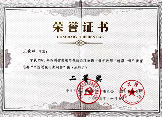 王晓峰老师荣获2023年四川省高校思想政治理论课中青年教师“精彩一课”讲课比赛 “中国近现...